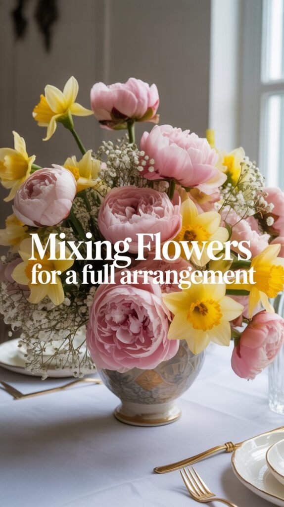 Combining different flowers creates a richer and more dynamic look. Mixing peonies, daffodils, and baby’s breath adds layers of texture and color. This makes your arrangement look professionally styled. You can play with different heights and shapes to make it more interesting. Adding greenery helps balance the colors and fill empty spaces. This type of arrangement is perfect for dining tables or special gatherings. It instantly becomes the focal point of the room.